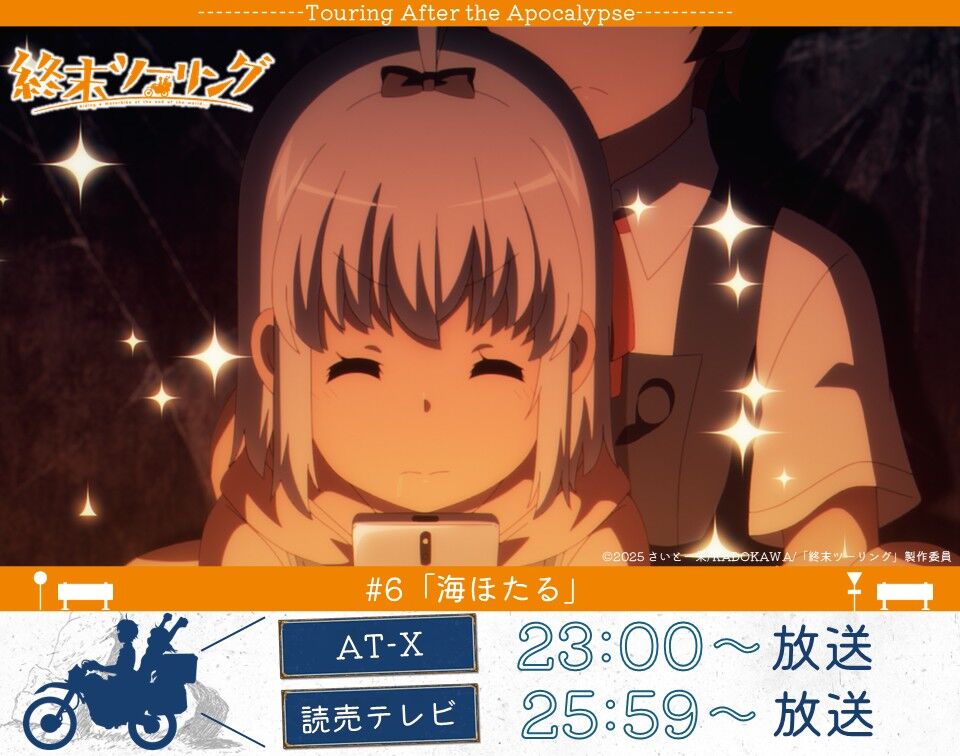 『終末ツーリング』第6話のタイトルは「海ほたる」。放送日は2025年11月8日(土)23:30〜です。嵐の東京湾アクアラインを越え、暗闇の海ほたるでの探索が描かれる幻想的な回です。