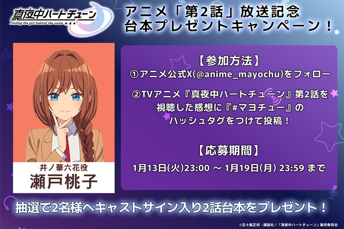 @igagarashiTVアニメ『#真夜中ハートチューン』 第2話 本日放送! 今日はいつもより15分遅い23時15分スタートです 主人公かなりのナイスガイなので見守っていただければ! #マヨチュー pic.x.com/5IrlsHomvP
